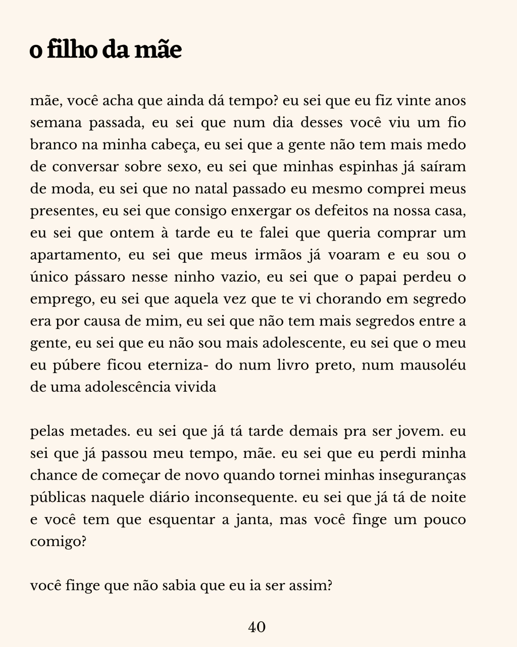 “hematoma” é um aglomerado de poemas que fedem a ferida aberta. ele surge, primeiro, como várias conversas: com uma mãe, com um ex-namorado, com o filho da puta que quis te comer e bloquear seu número no mesmo dia. em cada conversa você se pega falando coisas diferentes, agindo de jeitos diferentes, mas todas as palavras que você diz teimam em soar como um pedido de desculpas. eu não queria amar desse jeito, foder desse jeito, ter a pele marcada por hematomas desse jeito, ter nascido desse jeito. me perdoa?